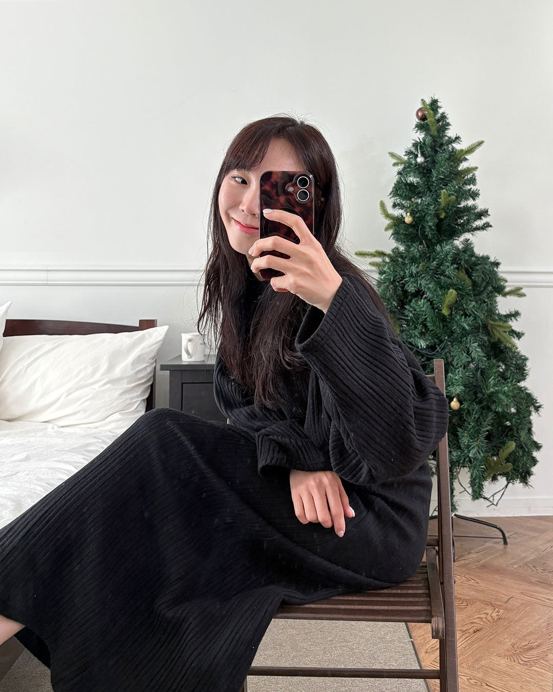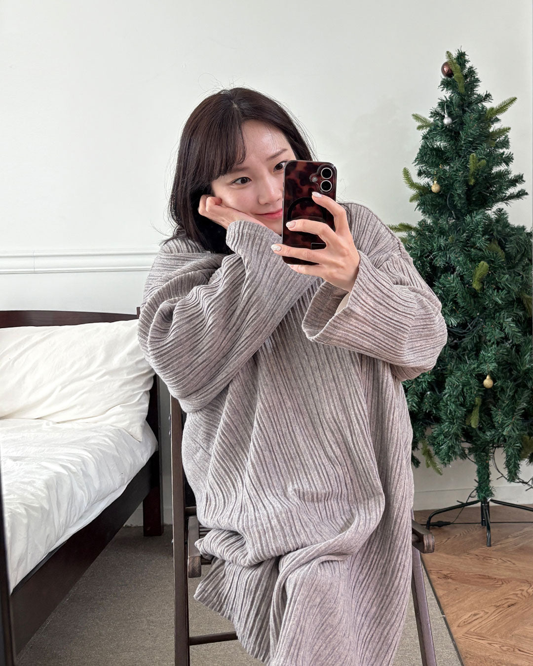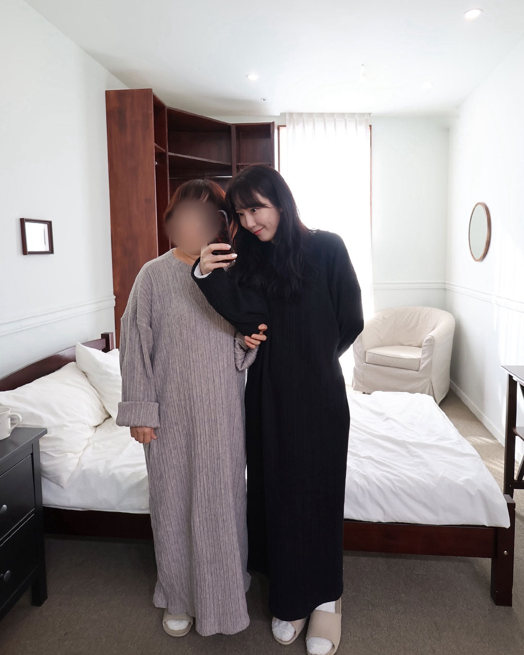 寒い日は、つま先まで包み込めるロング丈のルームワンピース。