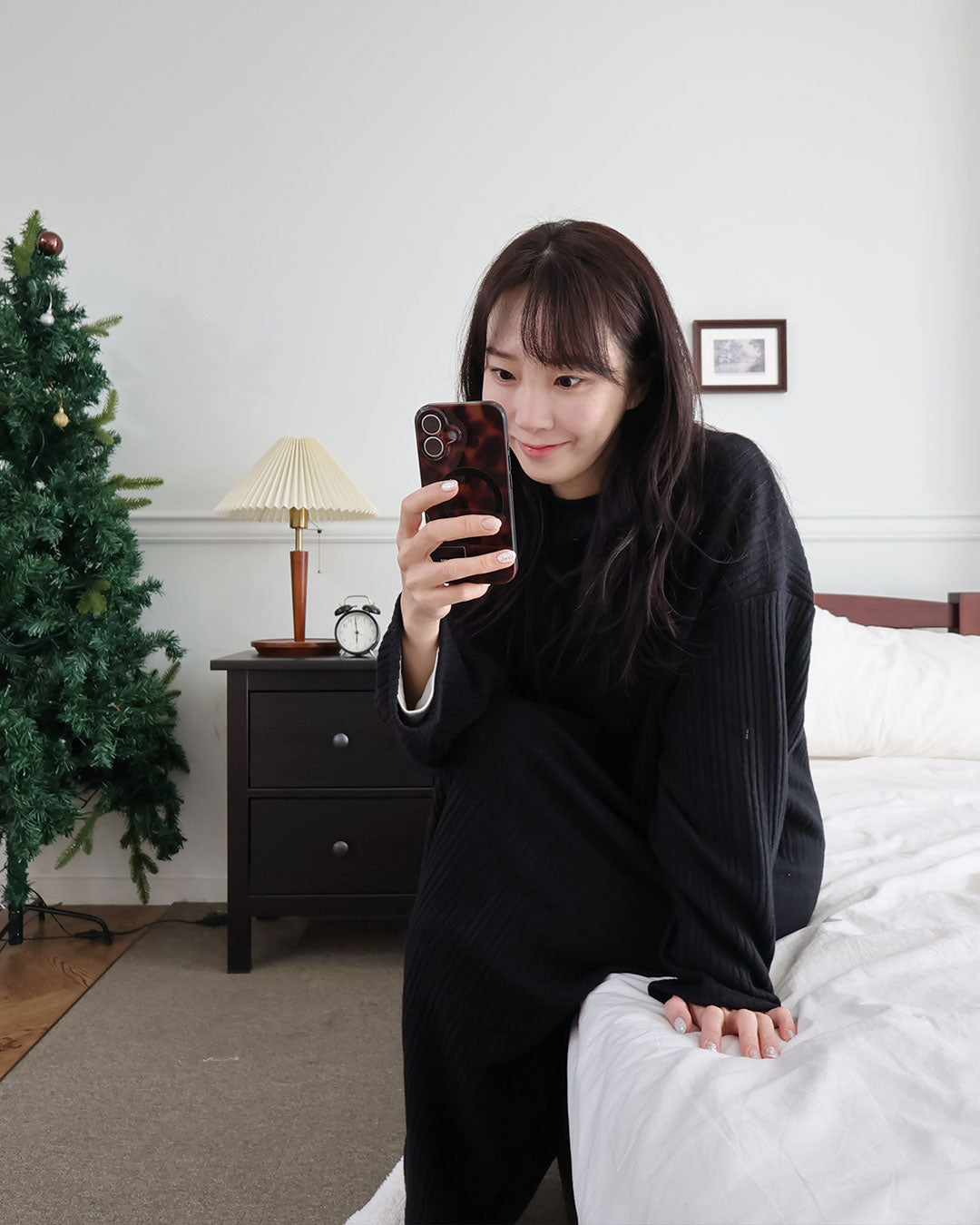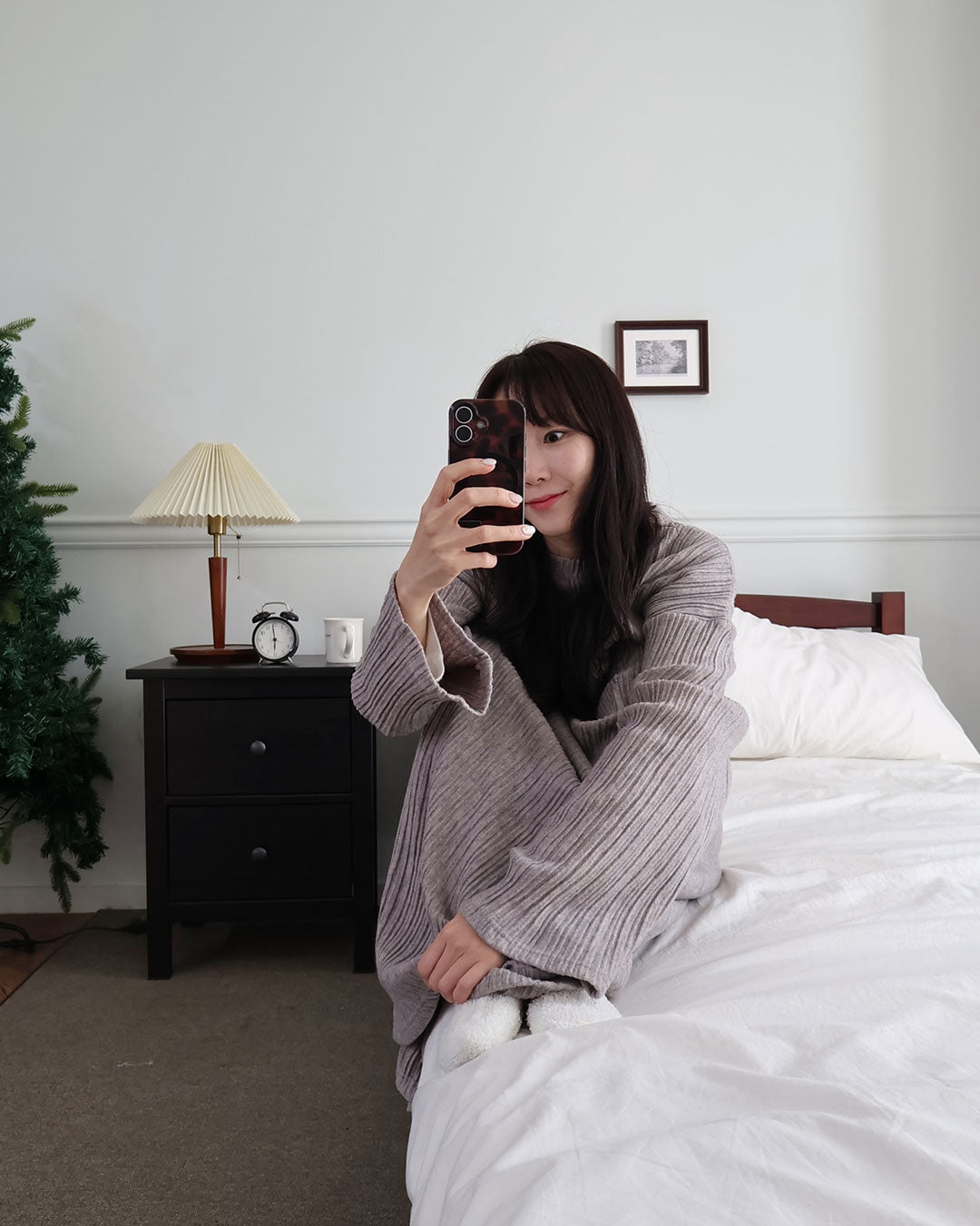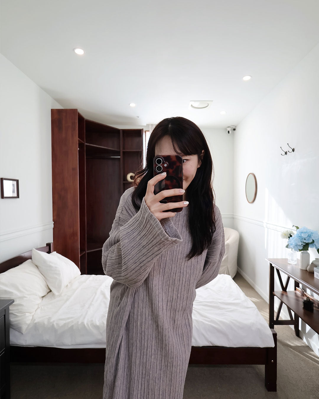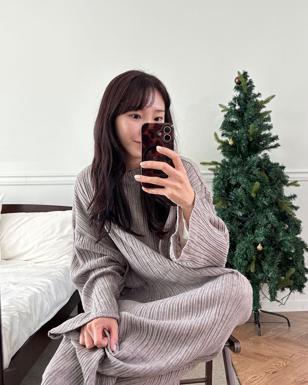 寒い日は、つま先まで包み込めるロング丈のルームワンピース。